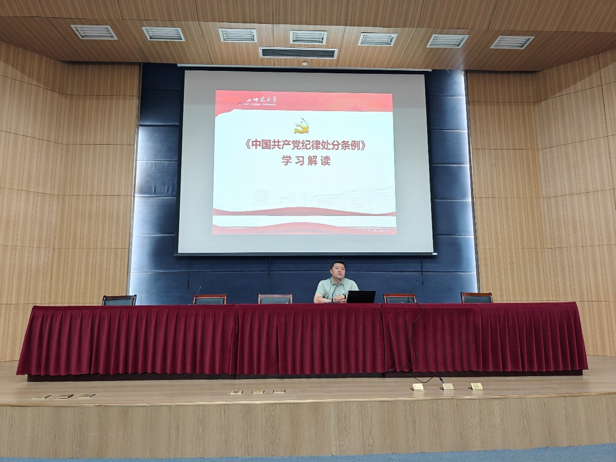 2024年6月26日下午,我院于西教2号楼101报告厅召开全体党员大会,围绕《中国共产党纪律处分条例》(以下简称《条例》)开展专题学习。我院党委书记葛大伟为全院教职工党员上专题党课。